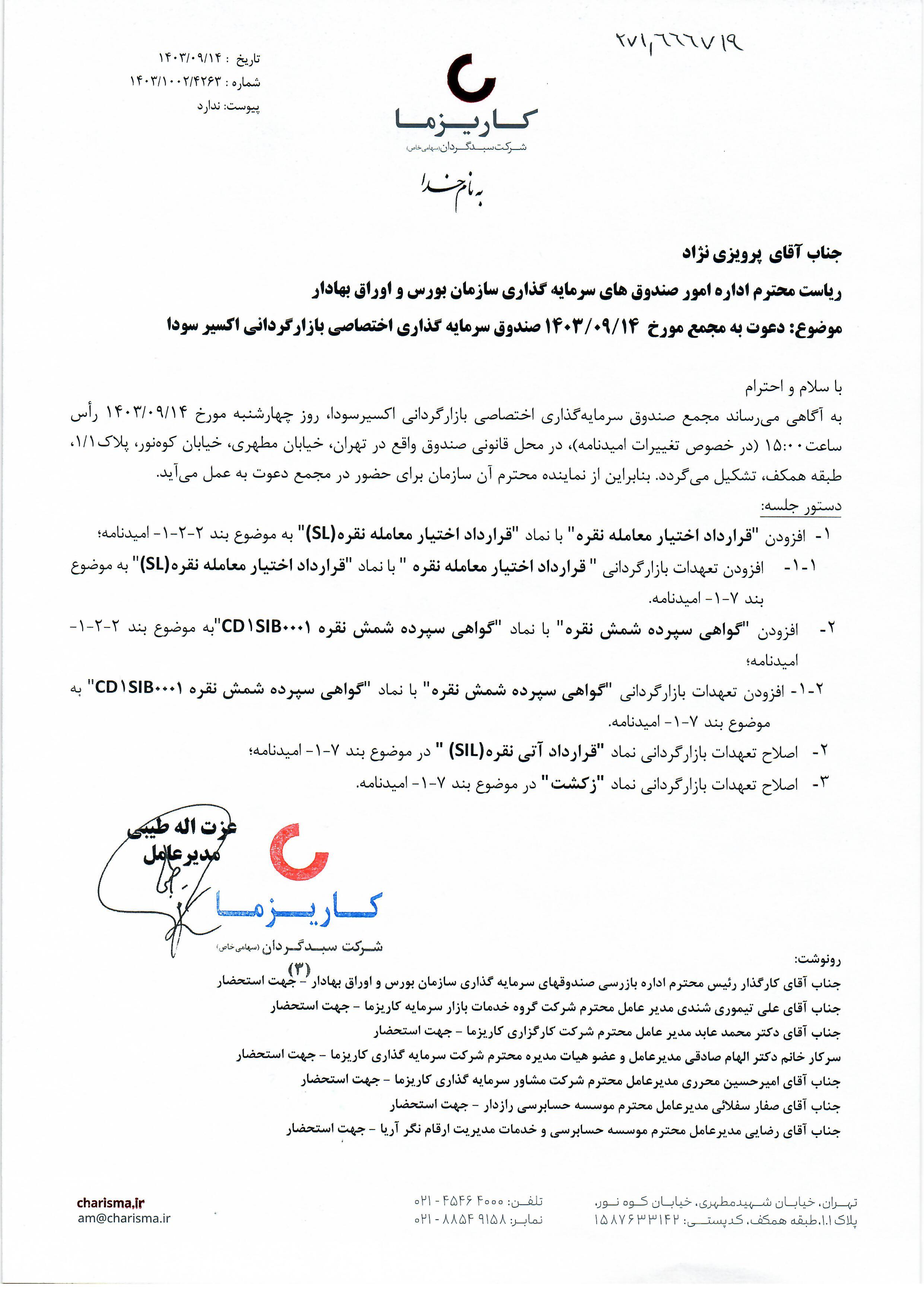 آگهي دعوت به مجمع مورخ ۱۴۰۳/09/14 صندوق سرمايه گذاري اختصاصي بازارگرداني اکسير سودا