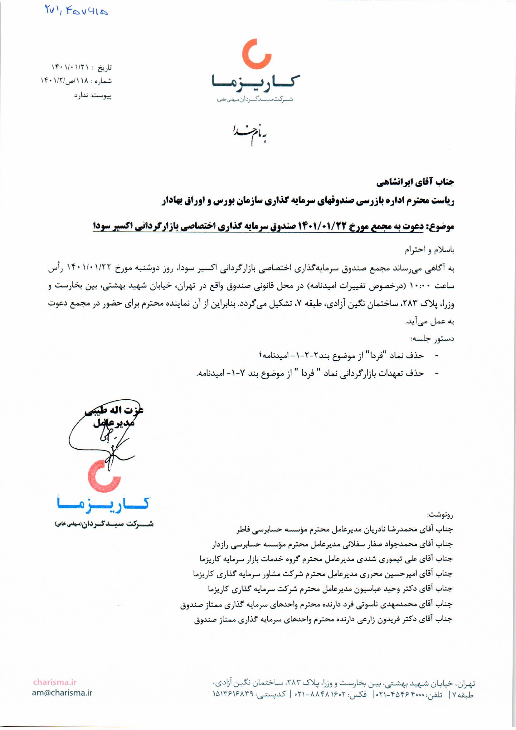 آگهی دعوت به مجمع مورخ 1401/01/22 صندوق سرمایه گذاری اختصاصی بازارگردانی اکسیر سودا در خصوص حذف نماد فردا