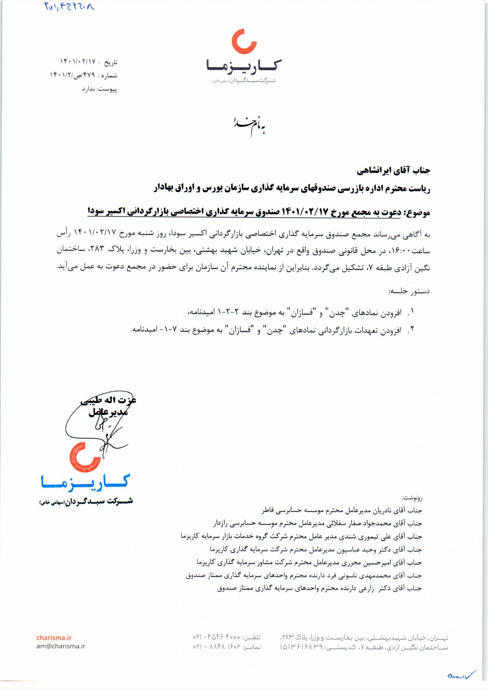 دعوتنامه مجمع مورخ 1401/02/17 صندوق سرمایه گذاری اختصاصی بازارگردانی اکسیر سودا