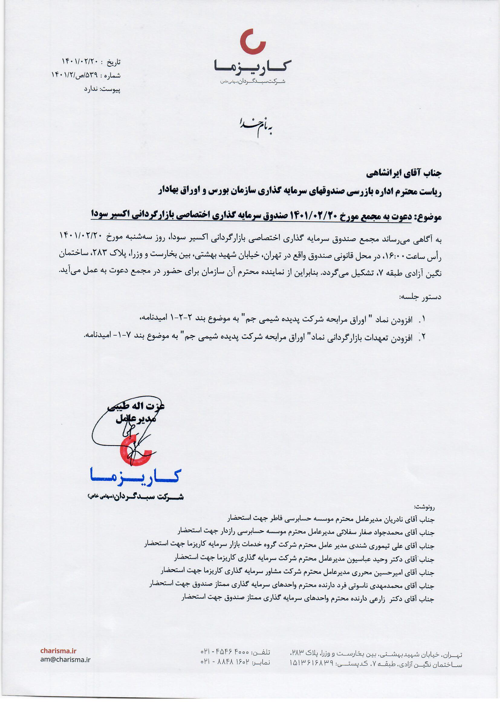 دعوتنامه مجمع صندوق سرمایه گذاری اختصاصی بازارگردانی اکسیر سودا مورخ 1401/02/20