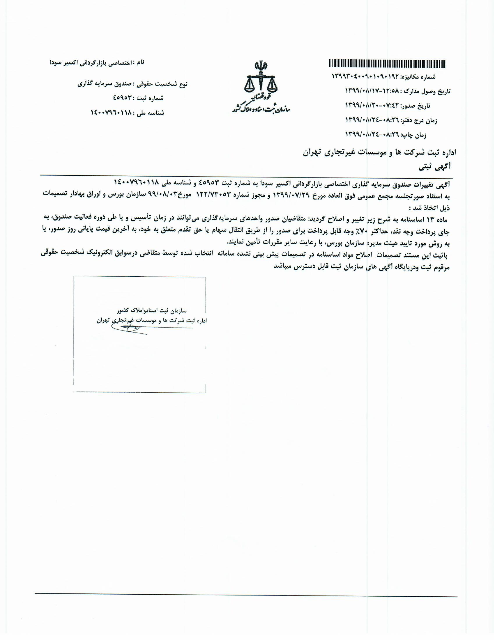 صورتجلسه مجمع مورخ 99/07/29صندوق اختصاصی بازارگردانی اکسیر سودا به همراه تأییدیه سازمان بورس و اوراق بهادار(درخصوص تغییر ماده 13 اساسنامه)