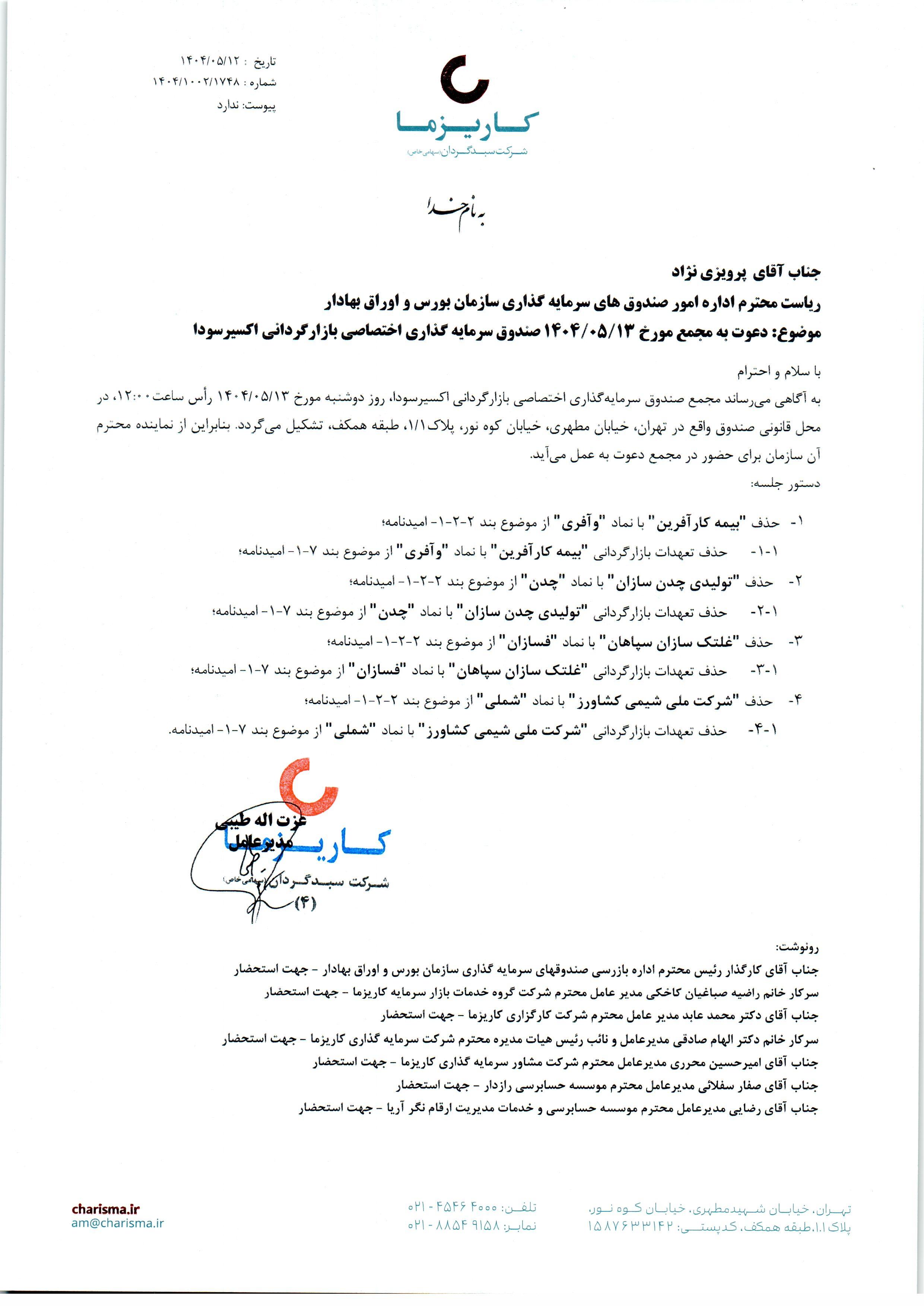 آگهي دعوت به مجمع مورخ 1404/05/13 صندوق سرمايه گذاري اختصاصي بازارگرداني اکسير سودا