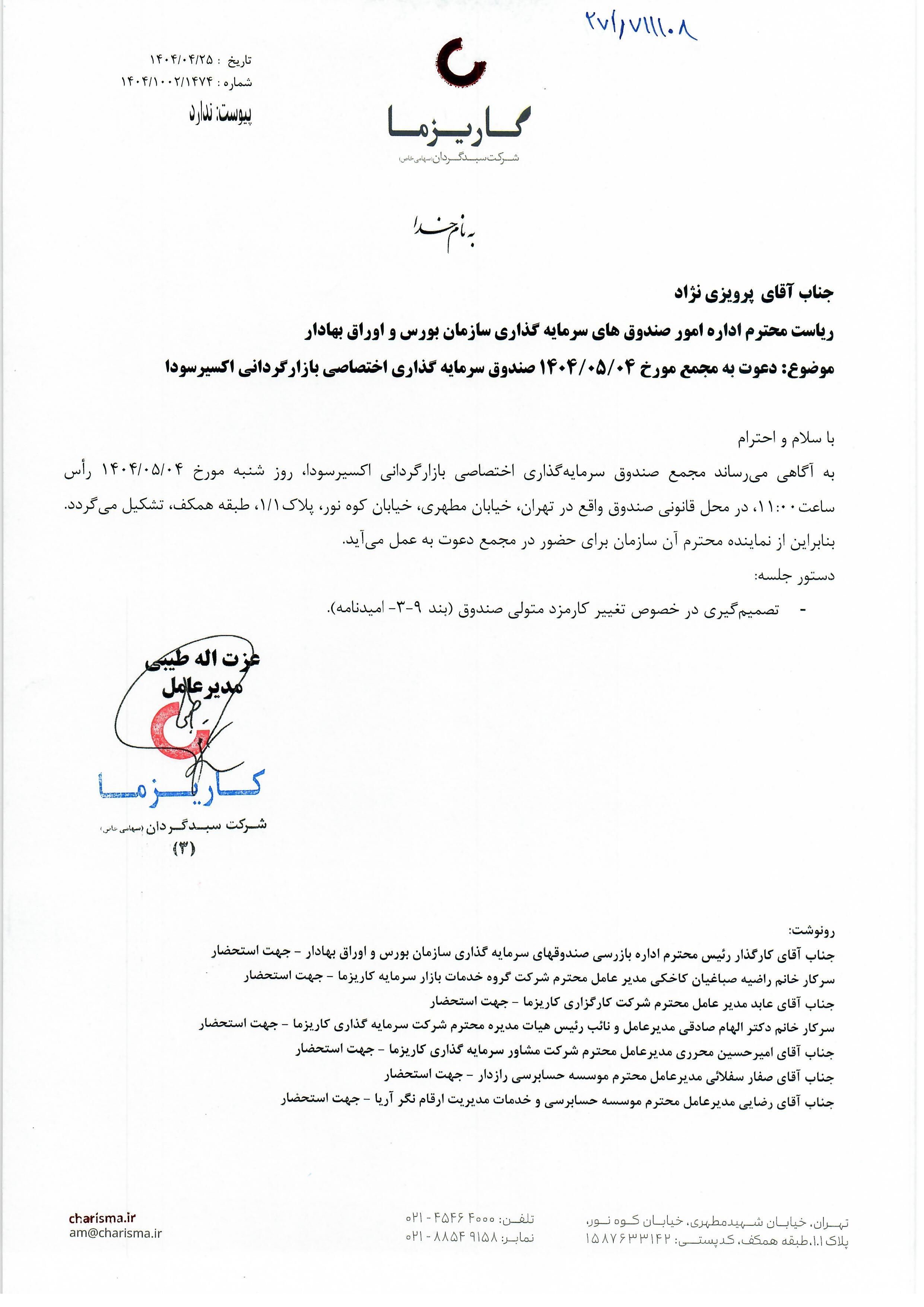آگهي دعوت به مجمع مورخ 1404/05/04 صندوق سرمايه گذاري اختصاصي بازارگرداني اکسير سودا